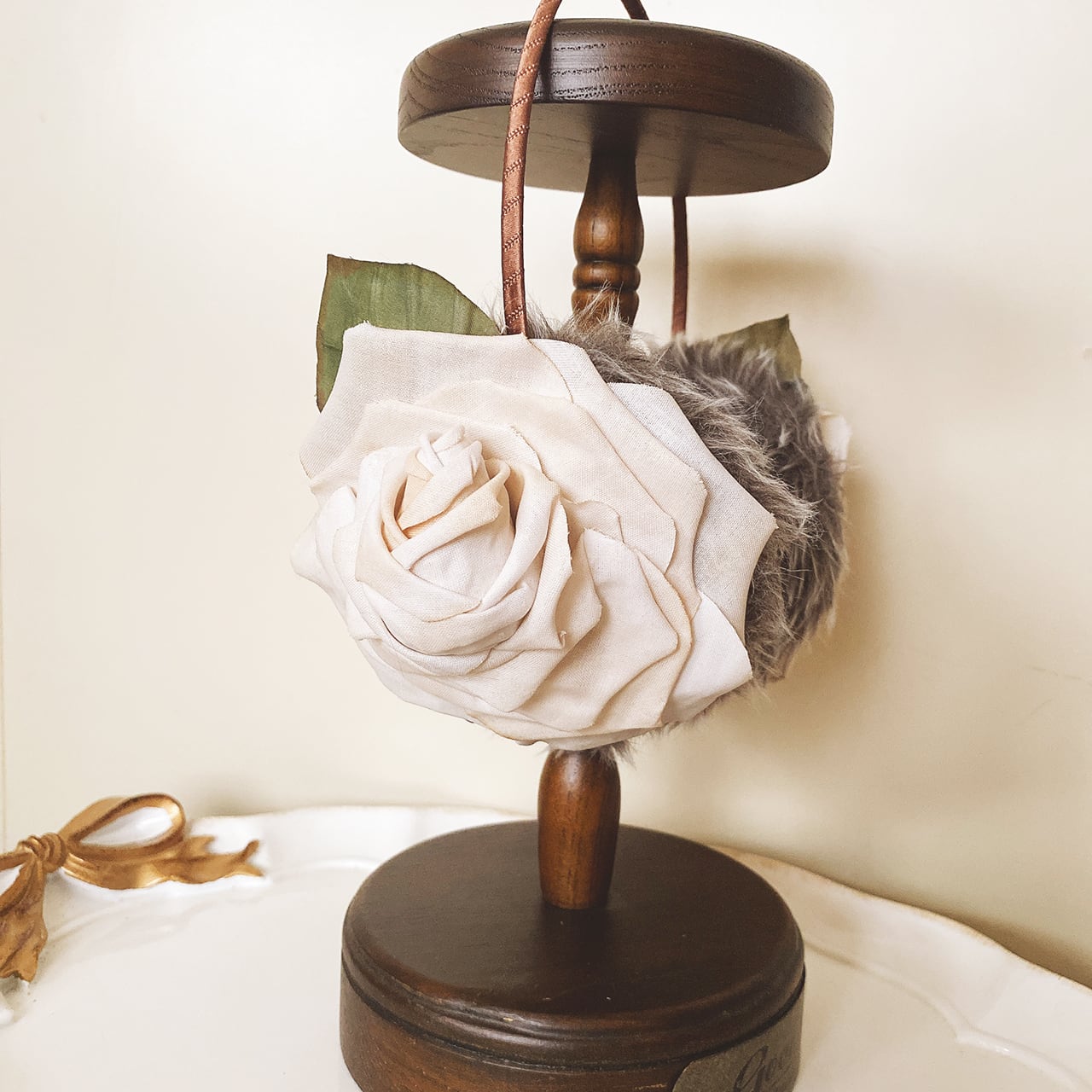 紅茶染めしたコットンのバラを使ったイヤーマフです。